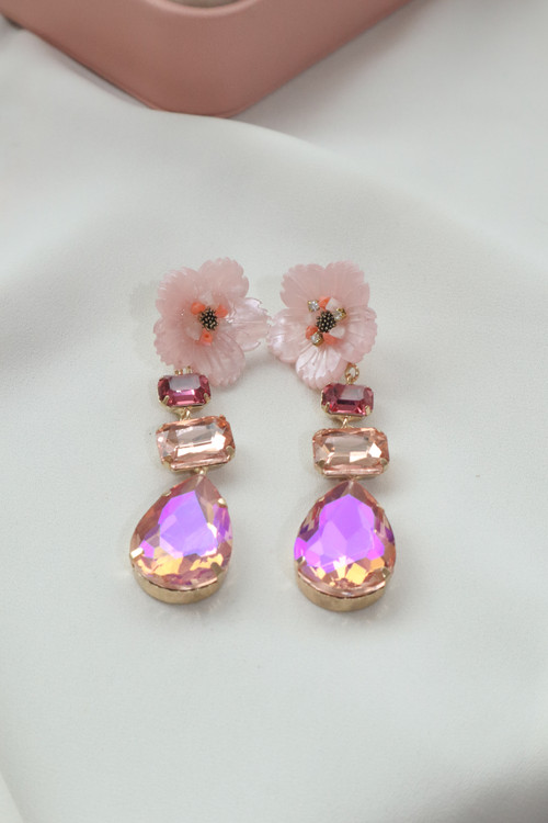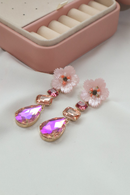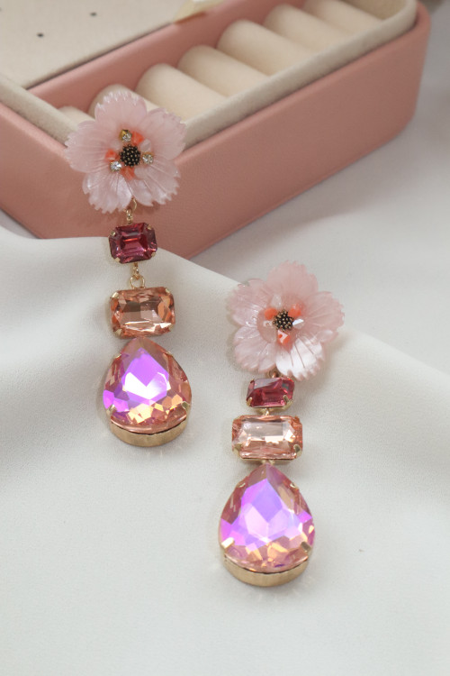 گوشواره جواهری برند زارا (Zara) با نگینهای درشت صورتی و طرح گل، انتخابی خیرهکننده برای مجالس است. پایه نقره این گوشواره سلامت پوست شما را تضمین میکند.